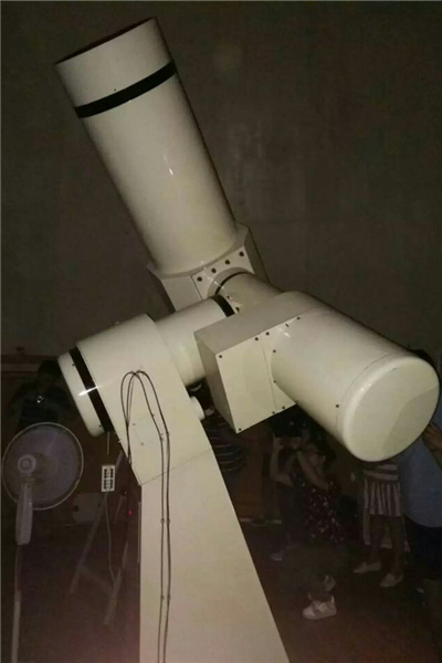天文台圆顶有360度旋转、经纬度调节等功能,可实现望远镜与地球自转同步,更易于追踪星体。中秋当晚天气晴朗,清风习习,望月当空。如果说夜空是一场灯会,月便是在点点星光的映衬下最耀眼的素色花灯。通过望远镜可以清晰的看到月的表面,明亮、皎洁。那泛着淡黄的宣纸及其上点缀着的连绵、淡雅的环形山,仿佛是一幅独具匠心的中国水墨画。