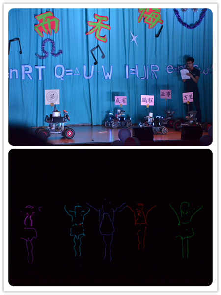 我院毕业晚会的经典节目——科技秀,每次展演都掀起了一番高潮:RoboMasters2015全国大学生机器人大赛中,“虎师队”自主研制的机器人赛车因精准的射击、完美的攻击、惊人的战斗力征服所有人,被专家和对手誉为“愤怒的炮手”。晚会上,载誉归来的“愤怒的炮手”伴随着激动人心的音乐惊艳亮相,带给了观众高科技的视觉冲击。由“蒲公英”科技教育传播团队带来的荧光舞创意十足,在暗黑的舞台效果下舞者宛若精灵轻盈起舞,观众在惊奇的同时感慨连连。互动环节中,主持人手持分贝计走向台下,测量互动效果,观众们的欢呼声瞬间爆棚,在全场回荡;在整个科技秀过程中展现了物理学院开放实验室学生最新研究成果的同时,分享节目中蕴含的引人深思科学原理、将科学的快乐传递给观众。