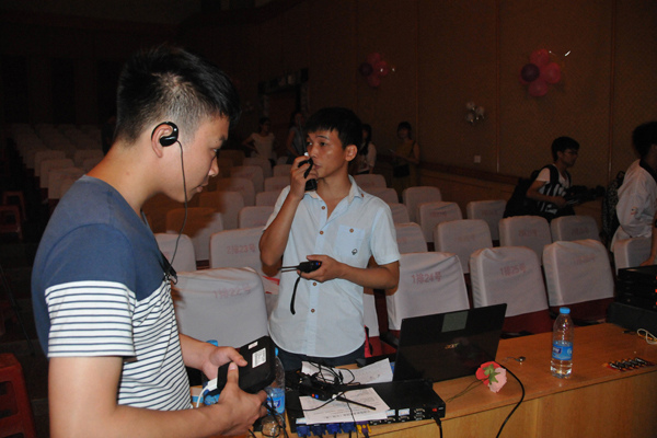 精彩的表演离不开所有工作人员们的辛勤付出。首次亮相的物理学院无线电爱好者协会CQ业余无线电俱乐部成员用所学知识,为本次晚会提供了无线电图像、语音应急通信保障服务,他们佩戴醒目的发光胸牌,利用协会无线电中继台在整个育才校区范围内协助各类工作人员对台前幕后现场进行调控,提供准确快捷的服务,为晚会“保驾护航”;并通过高清无线图传设备将晚会现场及特写镜头在两侧荧幕上进行实时直播,让观众能够从不同的角度观看晚会,充分调动观众们的感官,让整个晚会有了更直观更震撼的享受。