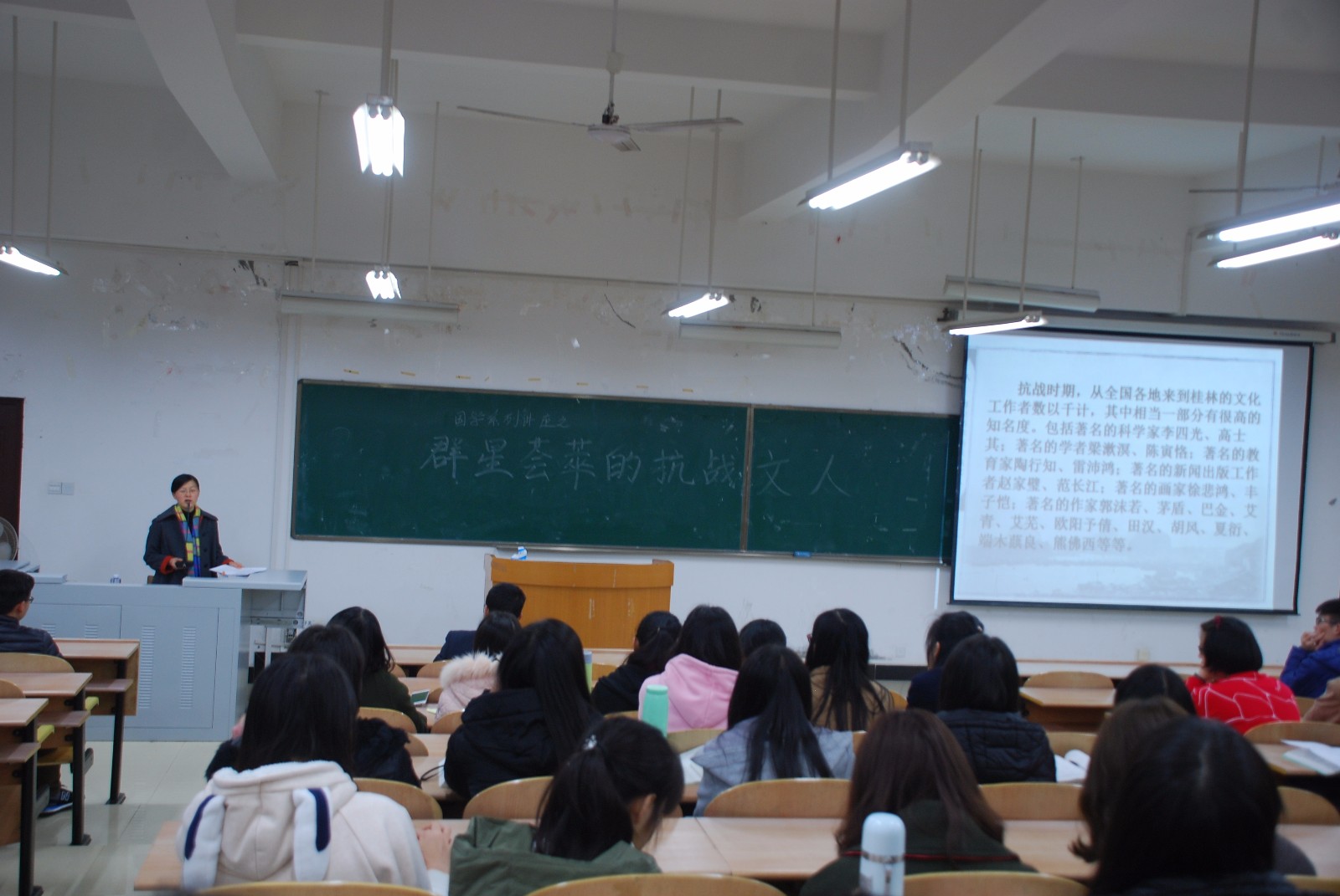 刘老师首先带同学们了解了抗战时期文化工作者转移到桂林的原因,详细地讲述了如田汉、陈寅恪、艾芜等名家在桂林艰难重重却仍努力创作、坚强乐观的经历,着重解读了反映时代背景的文学作品及其优秀品质,回顾了战争给人民带来深重灾难,并穿插介绍了在动乱中桂林人民积极生活、各类事业持续发展的事迹。针对桂林的文化,她表示:“桂林不仅有秀美的外表,还有阳刚厚重的一面,山水甲天下的风流掩盖不了她独立天地间的风骨,值得我们去铭记和了解。”