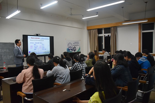 讲座的最后,胡老师对同学们未来的学习道路提出了良好建议,鼓励同学们积极考研。胡老师认为,在本科期间多见识一些科研项目,并亲身参与到其中,能提高自身的综合素质,并增加考研竞争力;而考研能提高同学们在社会中的竞争力,良好的知识储备更是能让人变得目光长远。在科研中学习到的良好的学习习惯,如查找及搜集资料等的能力更是让人受益终身。