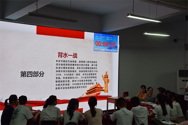 激动人心的抢答题环节是每届均设置的环节,不仅考察选手们的反应能力,更是考察选手们对知识的积累情况。17级的选手们虽年龄小,但凭借丰富的知识积累,清晰的逻辑,从容应答。思维辨析题环节结合时事材料回答提问,17级队针对“大学生党员应当怎样做好自身,并做好模范作用”提出独特见解,以清晰的条理应答如流,还提出了优秀学生党员应该“学习上是标兵、生活中是模范、身心上要健康、工作上是榜样”的倡议;对于“不忘初心,继续前进”的具体落实方法上,15级队表示,首先要进一步坚持和发展中国特色社会主义,随后结合本活动主题,阐述了继续加强党的自身建设的重要性,并强调了需坚持以人民为中心的发展思想,赢得了观众的掌声。在扣人心弦的“背水一战”中,16级队不甘示弱,自信的选择高分风险题,并获得了理想的分数。