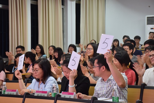 台上的选手们精彩答题,台下的观众们也跃跃欲试。互动环节首次采用易班“盖楼”形式,即在新媒体平台上留言答题,积极表达自己对时政的见解。除此之外,“声临其境”环节中由同学们对优秀影视片段进行配音,用新颖的方式让同学们深入学习党的历史,牢记党规党纪,其中,15级组声情并茂展现热播电视剧《人民的民义》中角色的情感,16级组用湖南话表达了《突破湘江战役》中毛主席的领导魄力,赢得评委与观众热烈掌声。