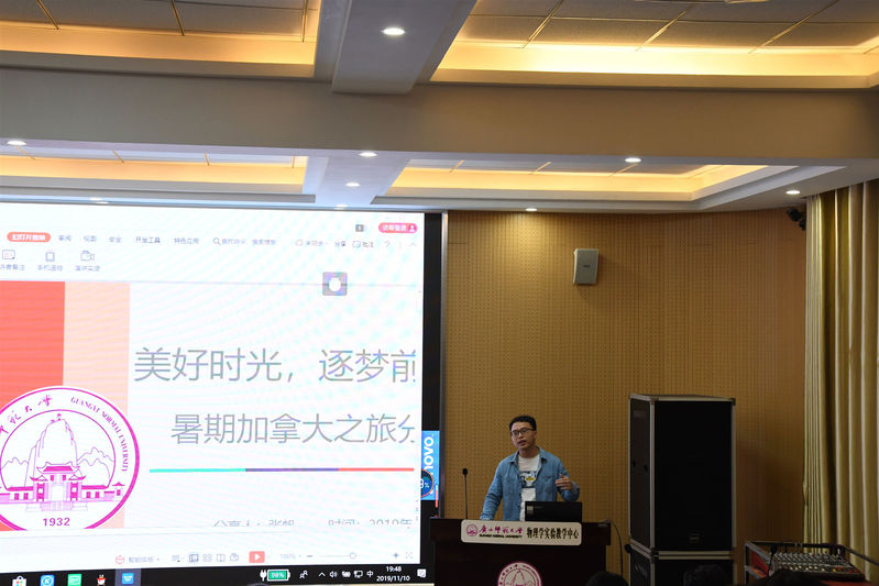 11月10日晚7点,胜游体育(SYsports)官方网站入口与技术学院在物理实验楼阶梯教室举行了“美好时光,逐梦前行”暑期加拿大游学分享会,参加2019年暑期加拿大“语言强化和创新创业课程”项目学习的2017级物理学专业研究生张帆为全体研究生做主题分享报告。