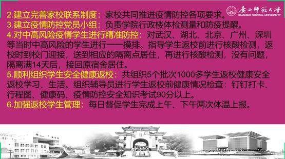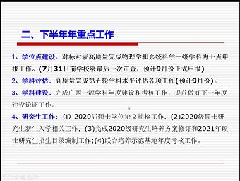 黄书记谈到,物理学与系统科学博士点的申报关系我院教学和科研实力的整体提升,是我院近期工作的重中之重,要集全院之力努力把申报工作做实做细。黄书记随后要求,疫情防控工作不能放松,原则上不前往中高风险地区,全体教职工假期期间必须实行网格化管理,履行必要的打卡和报备手续。同时,要积极配合学校公有住房清理工作,及时反映特殊情况和存在的困难,做到原则性和灵活性结合。在争创文明城市和文明校园上要提高思想认识,认真对照各项争创要求,积极配合桂林市和学校开展工作。
