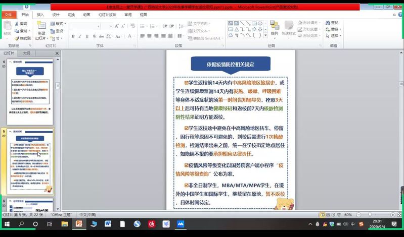 活动伊始,老师首先向同学们说明了需要暂缓返校的情况及疫情防控相关规定,加深了同学们对防疫知识的认识。紧接着老师讲解了返校前需要完成的各项工作和进校时的流程,让同学们对返校流程有了更深一步的了解。随后老师提醒同学们返校前要做好物品“四自备”,返校时积极配合工作人员完成学校的防疫工作,努力营造安心有序的校园环境。在会议的最后,老师提出了对同学们建议,希望同学们能认真落实学院疫情防控各项工作要求,返校途中注意安全,做好个人防护,做到平安返校。