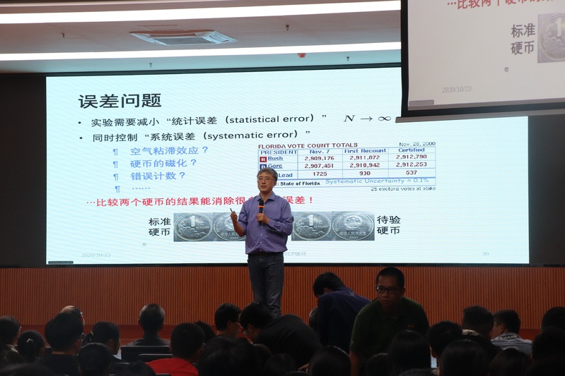 第一场讲座的主讲人是北京大学物理学院院长,核物理与核技术国家重点实验室主任,高原宁院士。高院士以宇宙中正反物质的不对称性为主题,从如何定义左和右、正与反开始,介绍基本粒子物理学中的分立对称性概念,追溯宇宙中正反物质不对称现象的起因,带领观众进入一个激动人心的物理学分支。高院士以图表数据分析,联系粒子正负关系,详细地阐述了正反粒子间的关联及反物质研究上的大问题,同时还分享了自身对于反物质探究的个人感悟。高院士表示,理论上认为,大爆炸后宇宙中应该存在等量的正反物质,但在今天的宇宙中却找不到反物质的存在,这是当代粒子物理与宇宙学研究中最具挑战性的问题之一。