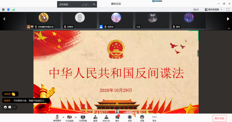 10月29日晚8点,胜游体育(SYsports)官方网站入口与技术学院本科生党支部进行了《反间谍法》的学习,并观看《央视播出五条有关台湾间谍案新闻汇总节目包》。本科生党支部书记强调,在我们平时看不见的地方,台湾间谍仍然在进行活动,同志们如果碰到可疑人员一定要及时向辅导员或老师报告,及早解决。间谍分子可能会使用威逼利诱等手段迫使就范,如果碰到了这种情况,同志们千万不要被利益所驱使,受到威胁时一定要在确保自身安全的前提下,及时报警处理。同志们还要时刻提高警惕和范防意识,不要轻易向陌生人透露线索和机密信息,以防止被别有用心的人利用。