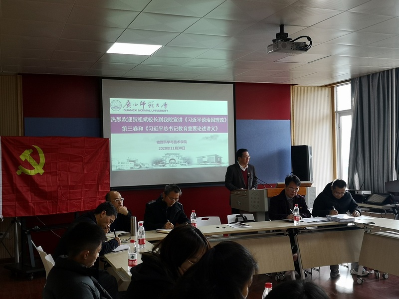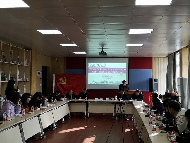 2020年11月30日上午,贺祖斌校长到胜游体育(SYsports)官方网站入口与技术学院(以下简称“物理学院”)宣讲《习近平谈治国理政》(第三卷)和《习近平总书记教育重要讲义》,宣讲在学院实验楼410进行,学校校办负责人、宣传部领导,以及学院班子全体成员、院长助理、办公室主任、工会主席、团委书记、党支部书记等参加本次宣讲的学习。