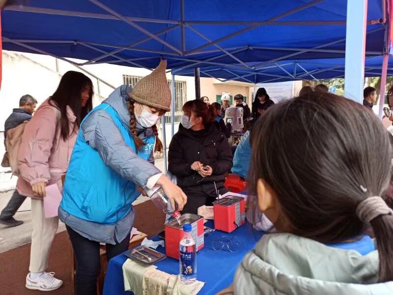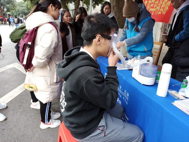 活动进行前期,尽管寒风刺骨,青协的工作人员们仍早早地来到东苑食堂前布置活动场地,等待同学们的到来。同学们在青协工作人员的引领下在校外眼科工作人员的介绍下,参加了视力测试,干眼spa,眼镜清洗等此次活动特有的内容。工作人员穿着白大褂指着视力表为同学们测试视力,还有工作人员在视力测试仪前给同学们进行精确地视力度数测量,并耐心地询问同学们的视力问题,为同学们增加了许多有关视力保护方面的知识。活动现场井然有序且十分热闹,同学们对于视力保护的重视程度体现在了他们活跃的参与度中。