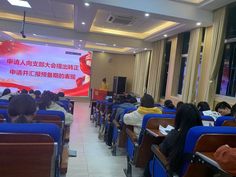 会议开始,由主持人清点到会人数。随后申请人向支部大会提出转正申请并汇报预备期的表现,由预备党员钟文虎等19位同志依次宣读自己的转正申请,详细汇报了自己在预备期间的表现,表达了入党的志愿和决心,并对自己在作为一名预备党员期间,在思想、学习和工作上的进步与不足作了认真的总结。紧接着,考察联系人对19名预备党员考察期一年内的思想、工作、生活等各方面表现情况分别进行介绍并发表意见。所有党员进行讨论并充分发表各自意见,拥有表决权的党员对预备党员进行了投票表决,投票结果为全票通过并当场宣读了支部的大会决议。转正党员虚心听取意见和建议,表明成为一名正式党员后,将不断地改善自身、提升自我。