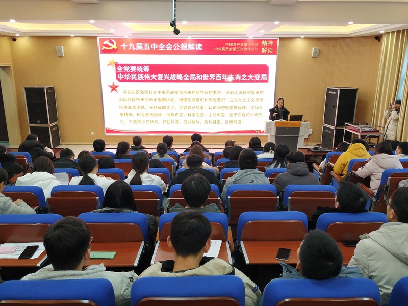 为深入学习贯彻党的十九届五中全会精神,加深学生党员对全会历史意义、现实意义的理解,12月31号,胜游体育(SYsports)官方网站入口与技术学院本科生党支部(以下简称“党支部”)在学院实验楼阶梯教室举办宣讲会。我校马克思主义学院学习贯彻党的十九届五中全会精神宣讲团成员、支部书记进行宣讲,支部预备党员、入党积极分子参加本次宣讲会。