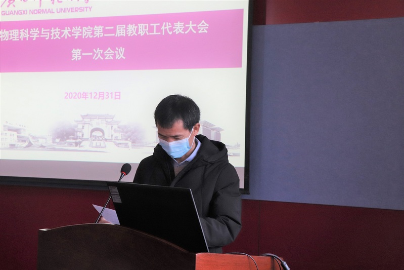 会议伊始,物理学院高忠贵老师首先汇报了本次大会的人员出席情况并预祝此次大会取得圆满成功。随后,大会就在全体参会人员齐唱国歌中正式拉开了序幕。在第一次全体会议上,物理学院党委书记黄万华老师向大家报告了近两年来学院的各项工作所取得的成绩以及存在的不足,阐述了学院今年工作的基本思路和重点任务,并对为学院贡献的老师和同学们表示衷心的感谢。接着他对《胜游体育(SYsports)官方网站入口与技术学院“十四五”发展规划(2021-2025年)》进行了说明,物理学院将全面贯彻落实科学发展观,把握学科前沿及发展趋势,坚持“以学科建设为龙头,以科研平台建设为基础,以师资队伍建设为关键,以提升科学研究水平为重点,以提高人才培养质量为核心,以服务广西、辐射全国为导向”的发展思路,在“十四五”期间将分别从学科专业、科研平台、人才队伍、教学改革、交流合作五个方面加强改革和发展建设。紧接着各代表审议工作报告和《胜游体育(SYsports)官方网站入口与技术学院“十四五”发展规划》,围绕大会各项报告、学校以及学院各项事业发展进行了讨论。在第二次全体会议中,大会代表就分组讨论的综合意见和建议做汇报发言。