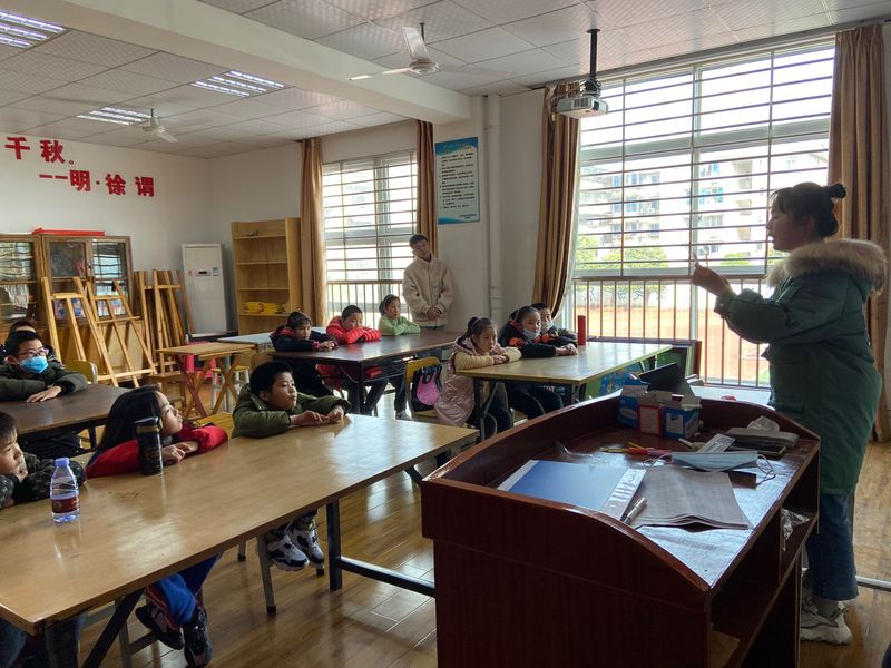 蒲公英团队的六位成员提前于约定时间到达穿山小学,在小学生活动中心迎接前来上课的学生。上课之前,蒲公英团队的小何老师做了简单的自我介绍,并且把上课的课堂纪律向同学们说明。