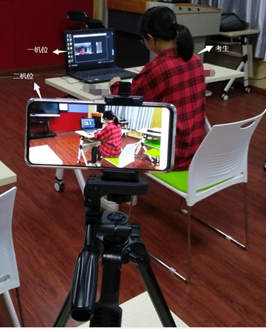 (4)复试要求双机位摄像。提前准备好一台电脑(带摄像头和麦克风)和一部智能手机,或两部智能手机。两台设备中,第一台为主机位(或一机位)(建议使用笔记本或PC机),要求放置在考生座位正前方,视频监控范围应保证考生在坐姿状态下能够完整清晰覆盖头部到桌面位置,面试过程中要始终保持双手在屏幕中显示;另一台为辅助机位(二机位),放置于考生后方45度左右位置,确保监控范围覆盖第一台设备的显示屏幕和考生本人头部、背部、手部,如下图所示。