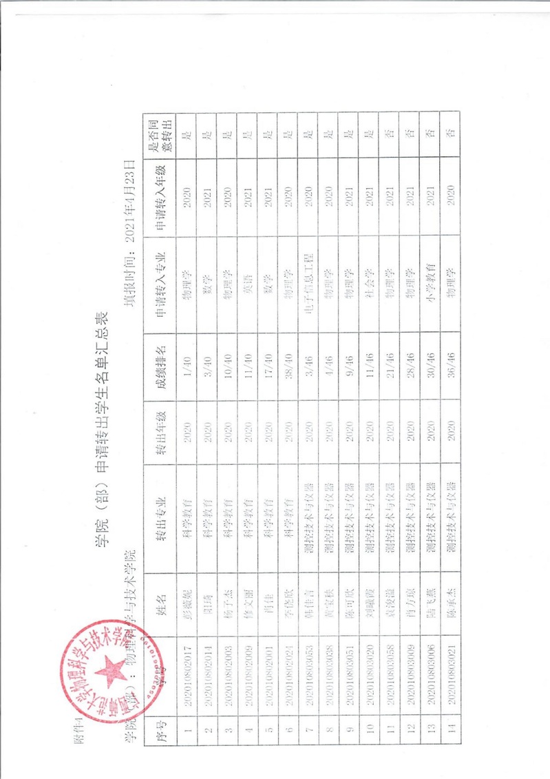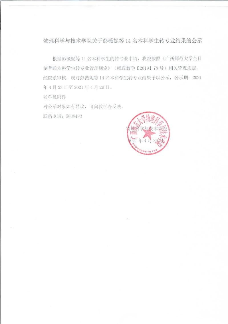 根据彭薇妮等14名本科学生的转专业申请,我院按照《广西师范大学全日制普通本科学生转专业管理规定》(师政教学 [2019] 78号)相关管理规定,经院系审核,现对彭微妮等14名本科学生转专业结果予以公示,公示期: 2021年4月23日至2021年4月26日。