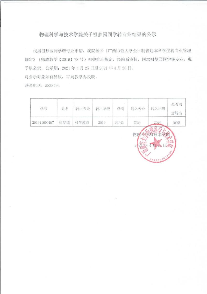 根据祖梦园同学转专业申请,我院按照《广西师范大学全日制普通本科学生转专业管理