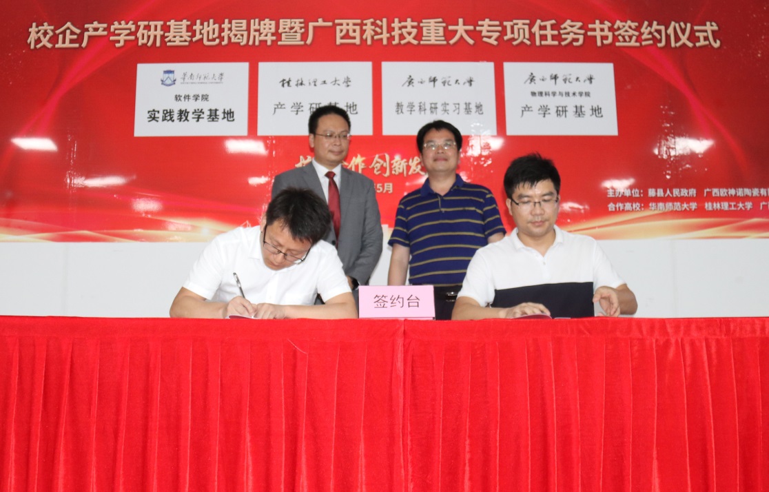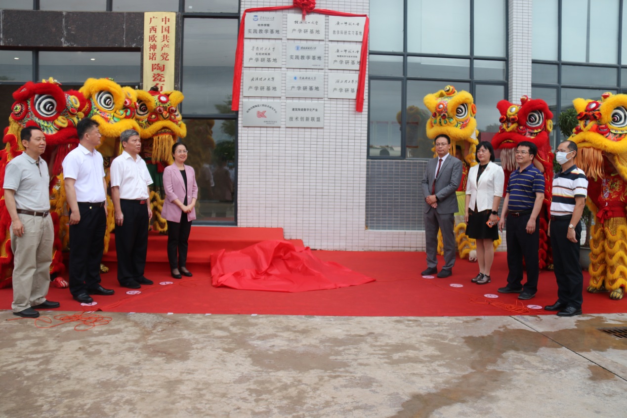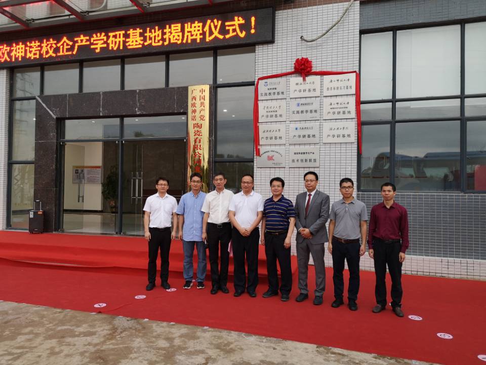 为充分发挥学校与企业双方的优势,深化校企联动,加强校企在科学研究和人才培养等方面的合作,2021年5月胜游体育(SYsports)官方网站入口与广西欧神诺陶瓷有限公司签订了教学科研实习基地和产学研基地合作协议。5月31日,在学院党委主要负责同志带领下,学院领导和教师一行5人代表赴梧州藤县参加了与广西欧神诺陶瓷有限公司校企合作教学科研实习基地和产学研基地的揭牌仪式。自治区工信厅、梧州市委、市科技局、藤县县委等领导参与了本次揭牌仪式。
