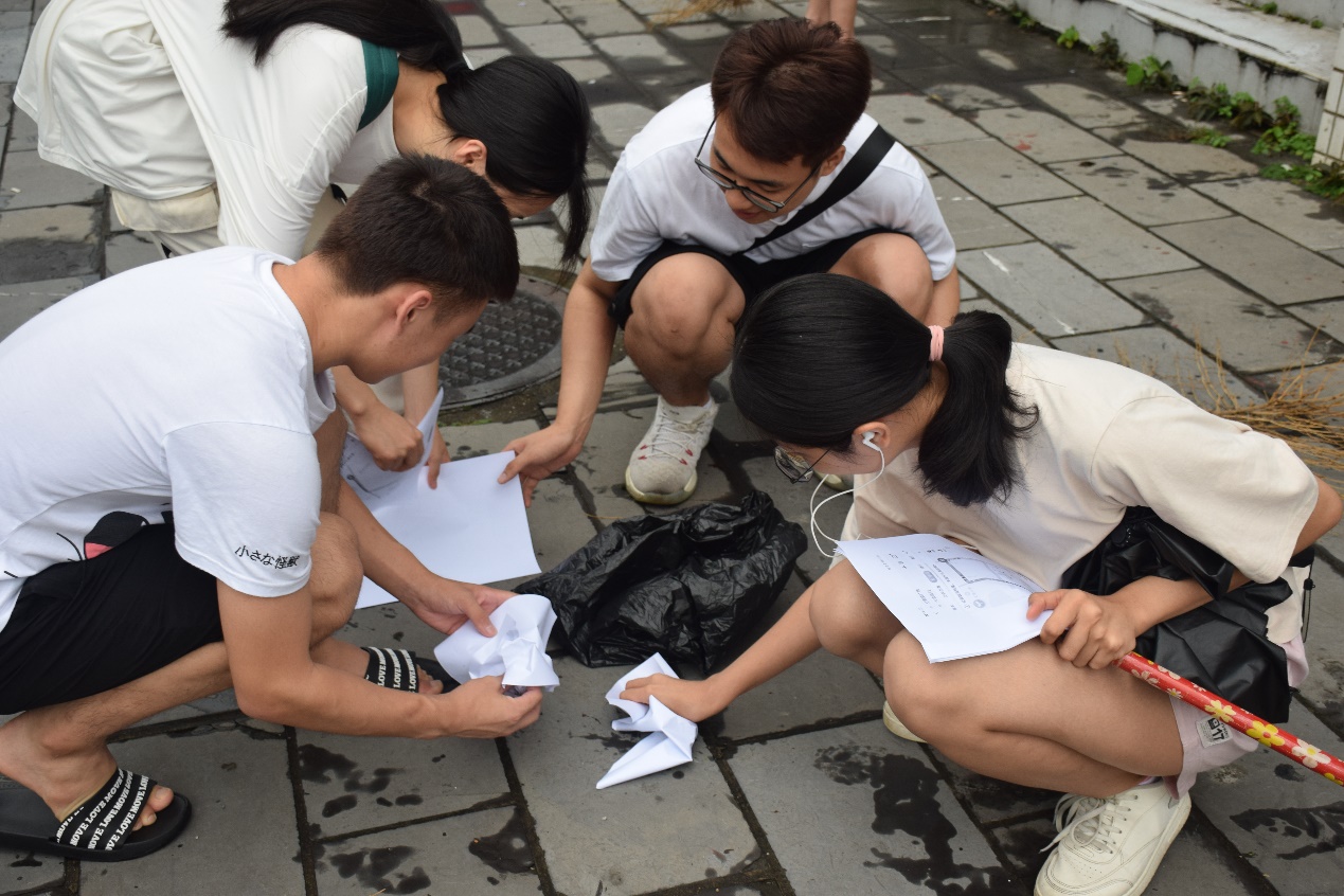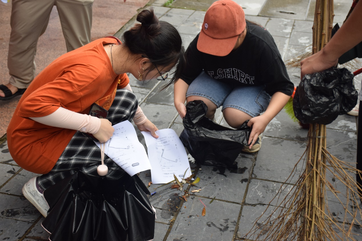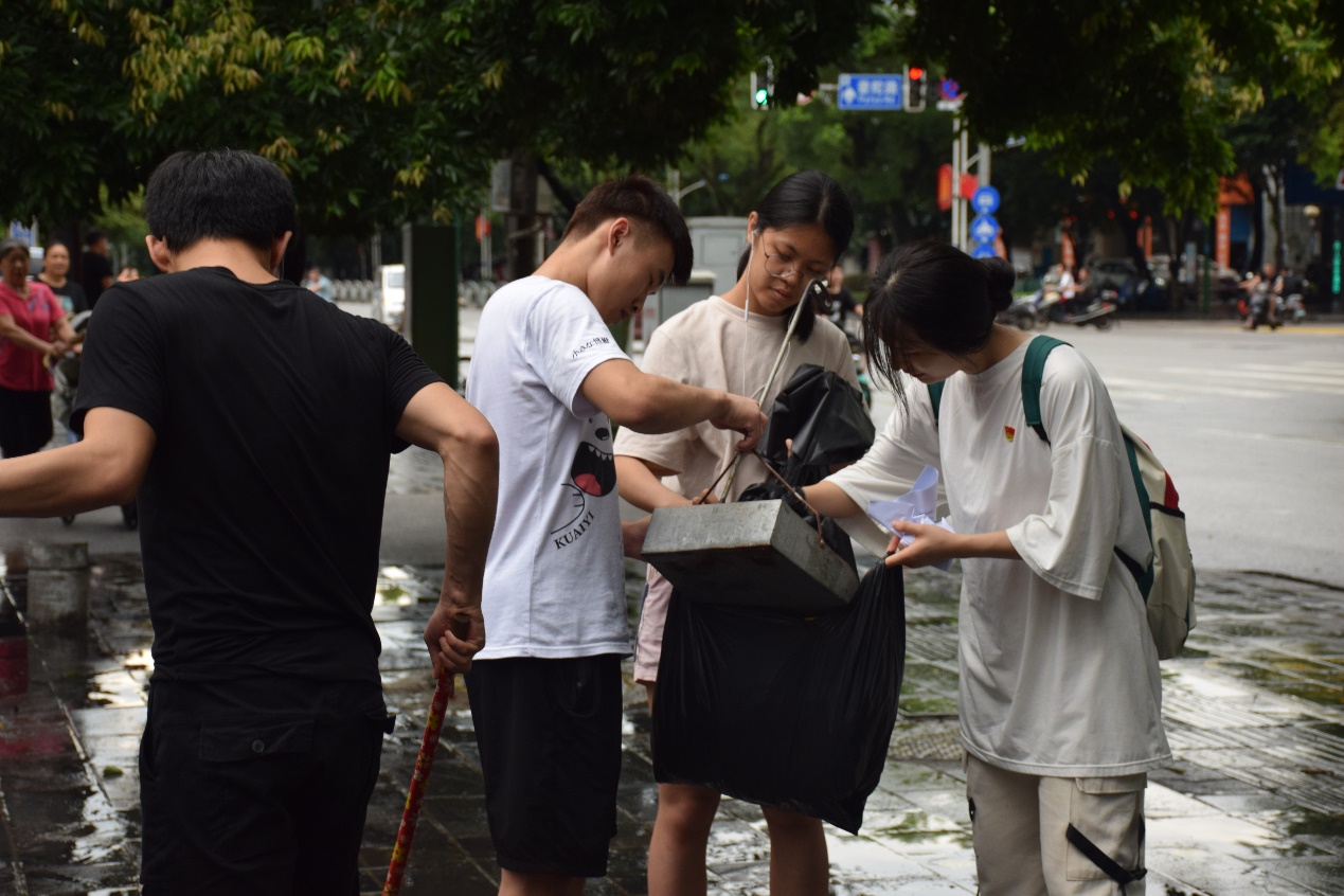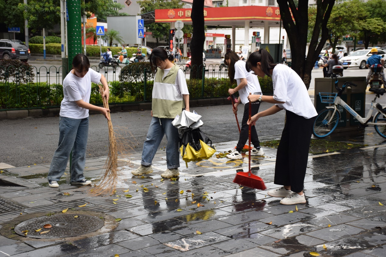 地面湿滑,但也挡不住大家清扫的热情。老师们以身作则,鼓励学生们的同时,也不忘弯腰捡起脚下的纸屑。店面旁积水,大家就用扫把清扫至下水道;路上的烟头,大家就用随身带的纸包住丢到垃圾箱;人行道上的落叶,大家就团结协作扫成堆后用垃圾袋装好。没有足够多的垃圾铲,就用垃圾袋套着手抓落叶,没有足够多的扫把,就用纸捡垃圾。也许天气不是很晴朗,但是大家身上却散发着青春活力,有责任。有担当的精神之光。
