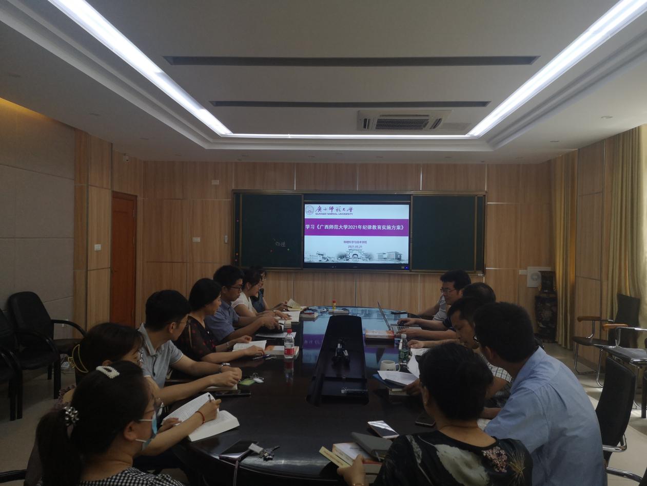 2021年5月21日上午,胜游体育(SYsports)官方网站入口与技术学院在105会议室召开党委会议(扩大),学习《广西师范大学2021年纪律教育实施方案》(以下简称《方案》),学院党委委员、学院党委主要负责人、行政主要负责人、领导班子成员参加学习。