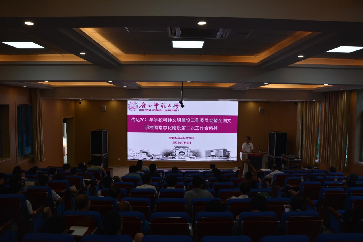 随后,学院党委主要负责人介绍了新入职的4位老师,并向大会传达了学校精神文明建设委员会的会议精神。他强调,为落实文明校园常态化建设要求,全体教师职工要落实《广西师范大学全国文明校园常态化建设工作的实施方案》。他指出,文明校园是一块含金量极高的招牌,是几代师大共同努力的结果,为把文明校园的招牌保持好,需要每位教职工提高政治站位,增强常态化创建工作的使命感和紧迫感;发挥主体责任,增强常态化创建工作责任感;盯紧任务目标,将文明校园常态化建设各项工作落实落细,共同为创建全国文明校园和全国文明城市努力做贡献。