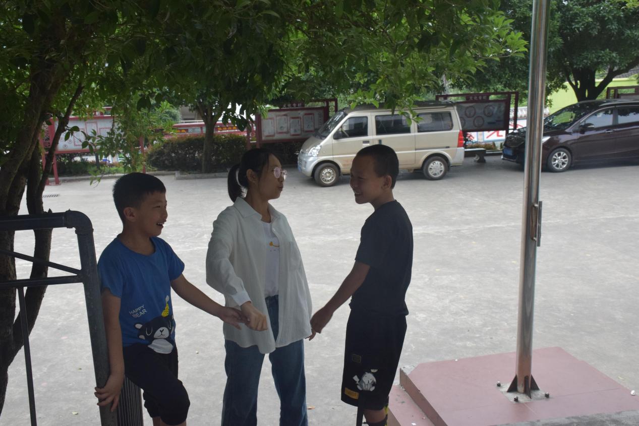 在课间时,两个小男孩在玩耍时发生了一些小摩擦,志愿者与他们耐心沟通,分析对错,安抚他们的情绪,给他们讲道理,最终两位孩子握手言和,并向彼此道歉。