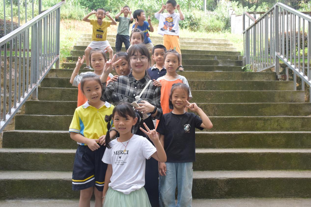 图为课间孩子们把志愿者团团围住在教室旁的阶梯上一起拍照,每个人都笑得很开心。 杨金婷摄