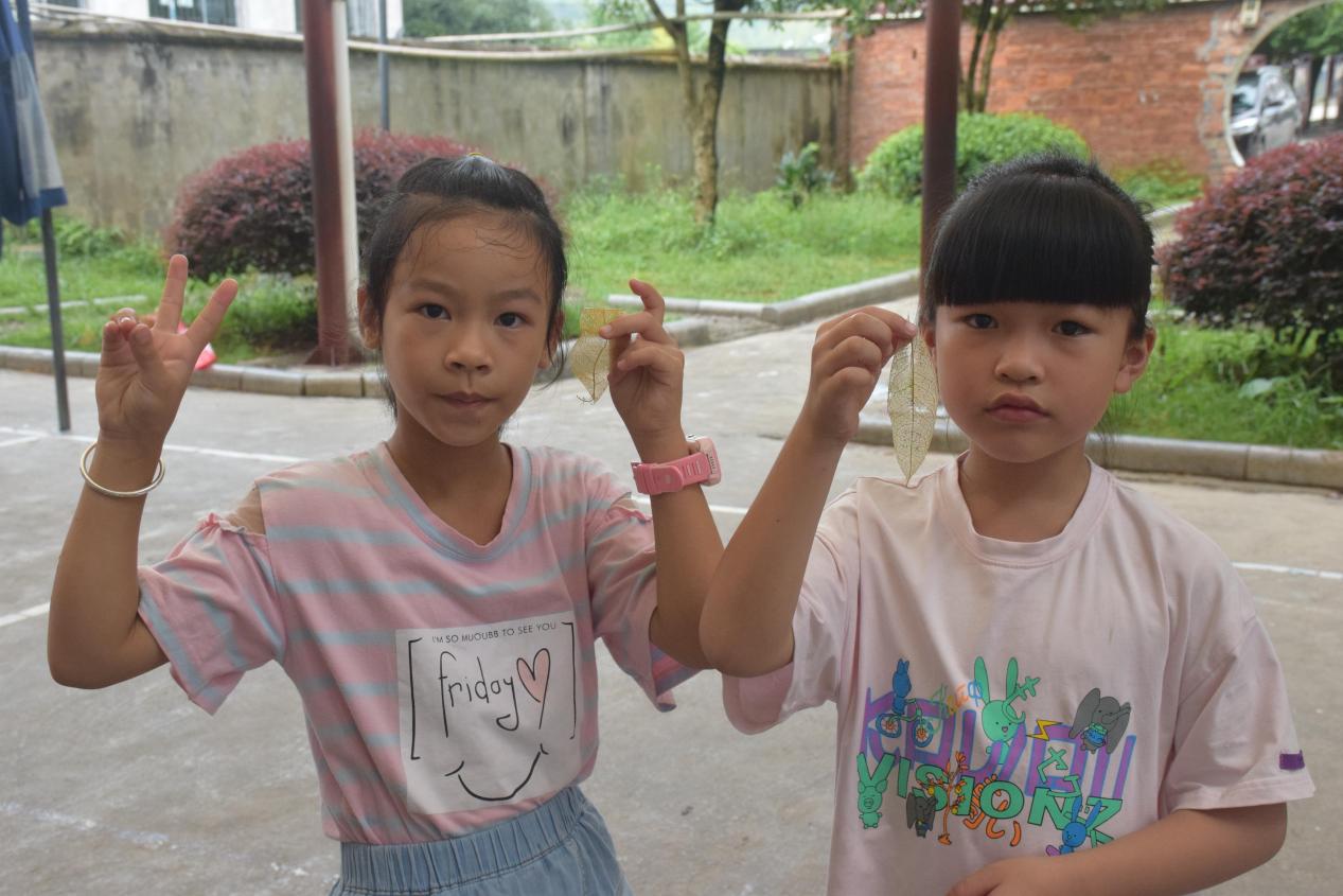 图为孩子们展示自己在志愿者的指导下完成的叶脉书签,为了让每个孩子都有自己的叶脉书签,志愿者连夜处理熬制了几个小时的树叶。 图 杨金婷摄