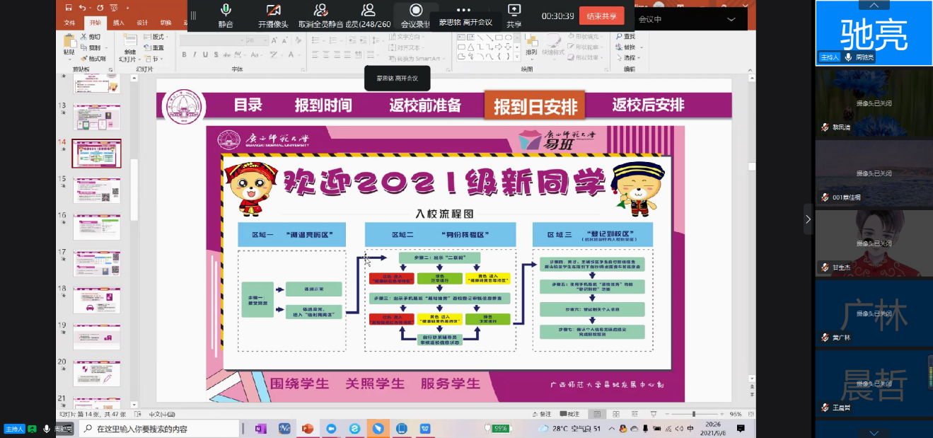本科生线上会议上,2021级辅导员严把学校疫情防控要求,围绕《广西师范大学2021年秋季学期2021级本科新生报到须知》等具体通知要求对新生返校前各项要求进行了详细讲解,包括学生报道地点、返校前材料准备、入校审核流程等方面,叮嘱新生做好返校前的充分准备,注意返校的交通安全和财产保护,并对新生关心关切的问题做了及时解答。