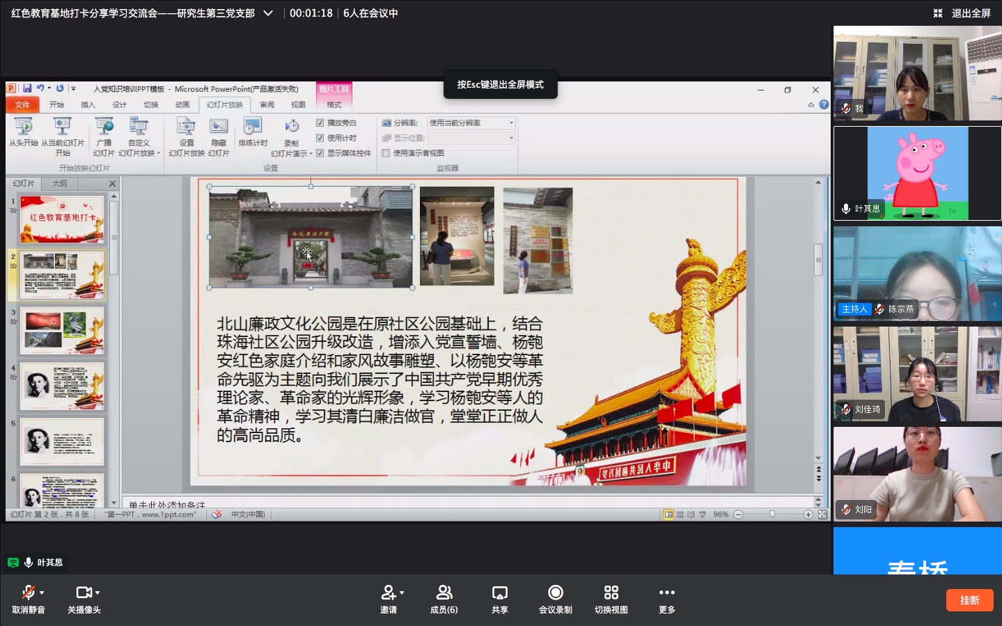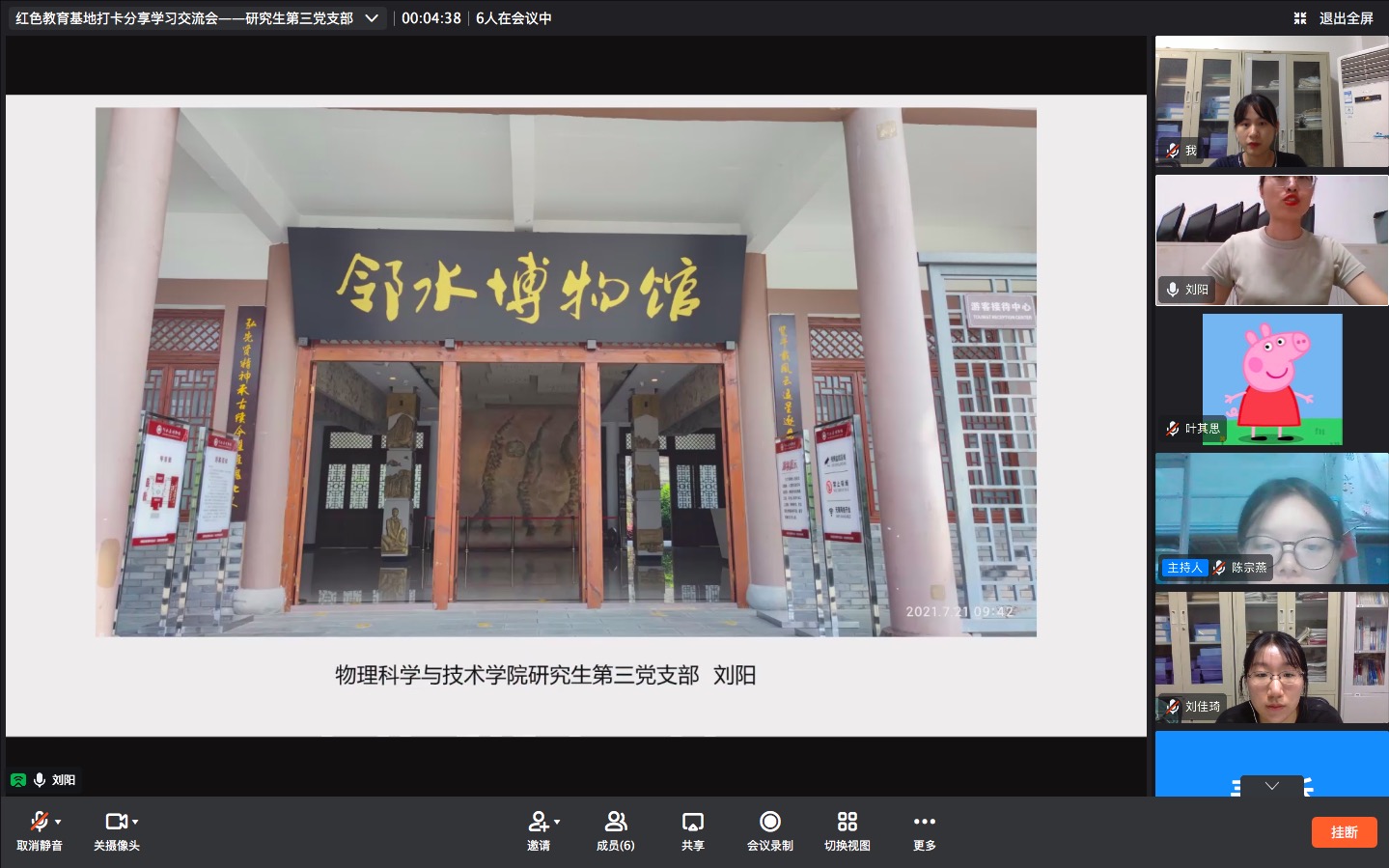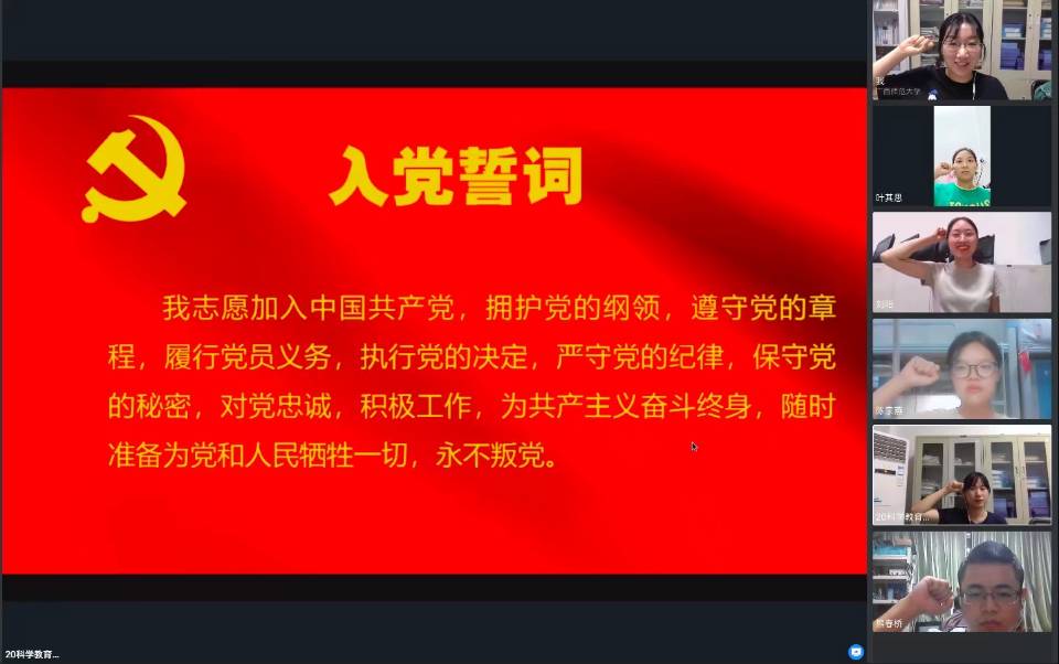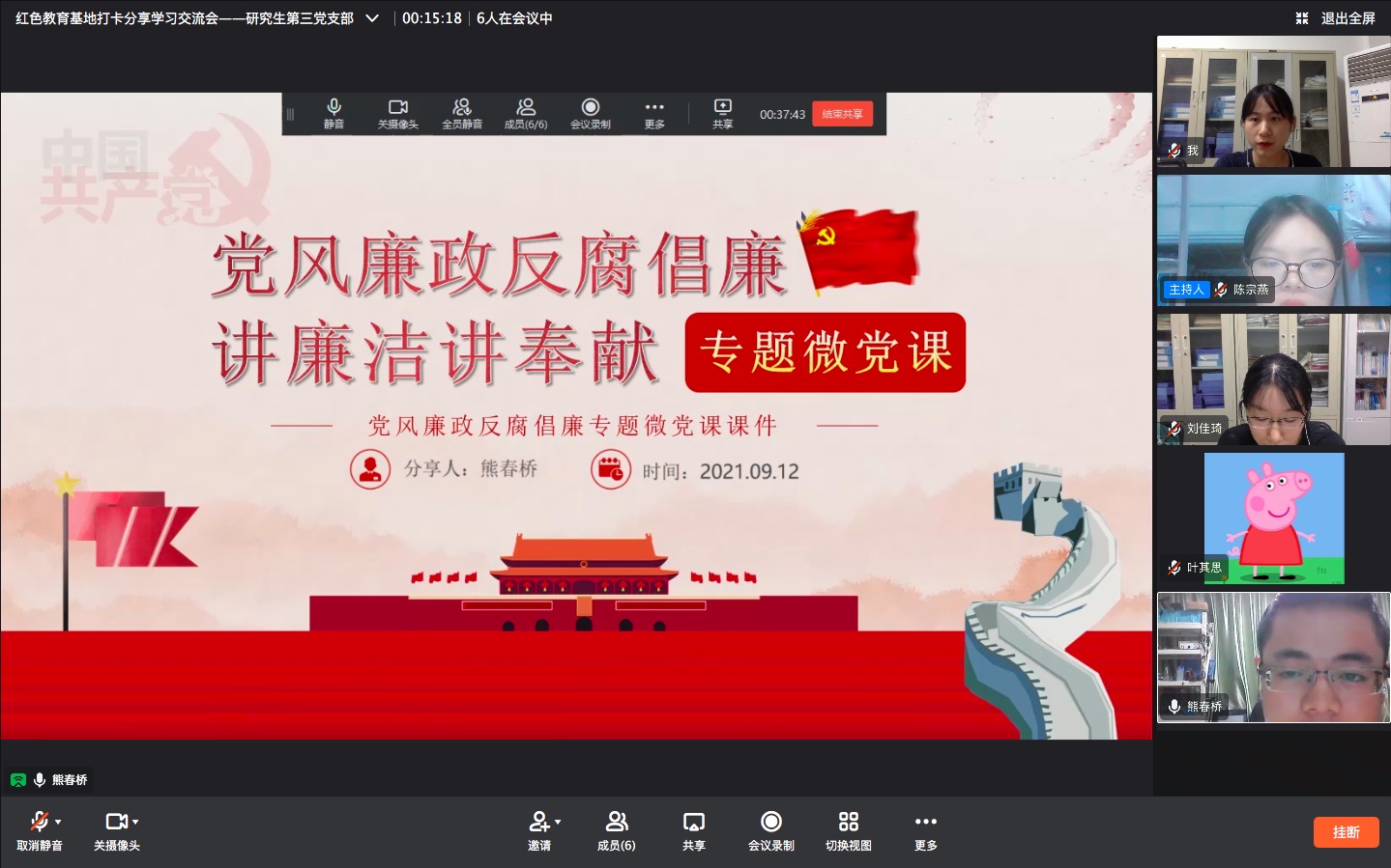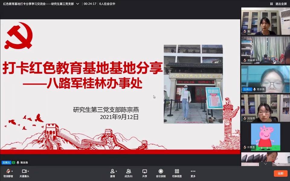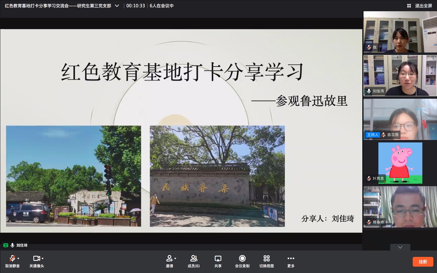 在活动中,吴叶同志为介绍了著名爱国将士,刘永福的事迹和他的故居,让同志们了解了黑旗军不怕牺牲的伟大精神。刘佳琦同志为介绍了鲁迅先生的故居,以及绍兴鲁迅纪念馆。让同志们了解到鲁迅先生弃医从文的心理历程。鲁迅先生说:“愿中国青年都能摆脱冷气,只是向上走,不必听自暴自弃者的话。能做事的做事,能发声的发声。有一分热,发一分光。就令萤火一般,也可以在黑暗里发一点光,不必等待炬火。”陈宗燕同志从四个方面为我们介绍了八路军桂林办事处,并号召各位同志要不忘历史,牢记过去,继承优秀革命传统,弘扬以爱国主义为核心的民族精神和以改革创新为核心的时代精神;继承和发扬艰苦奋斗的优良作风,坚持理论联系实际;发挥党员的先锋模范带头作用,全心全意为人民服务;珍惜当下来之不易的幸福生活,努力学习科学文化知识,为祖国的美好未来而奋斗努力。叶其思同志为我们介绍了北山廉政公园和杨匏安同志,了解到杨匏安同志在其母亲的影响下,怎样成为一名公正无私的人。刘阳同志给介绍了四川邻水博物馆,从另一个角度,身临其境的感受到了邻水县党组织的发展和壮大的历程,在“五四”余波后,邻水青年学子余旭等,成立了邻水旅京同学会“古邻社”,出版社刊《古邻新潮》,宣传新文化思想。熊春桥同志从党风廉政建设的重要性、如何抓好党风廉政建设、反腐的重要措施与成果、全面从严治党不忘初心四个方面,介绍了反腐倡廉的重要性。接着,支部书记陈宗燕同志对各位同志的分享进行了高度的评价和肯定,并且提出在今后的活动中,不仅要丰富活动内容,也要创新活动形式。活动的最后,所有党员同志一起线上重温了入党誓词。
