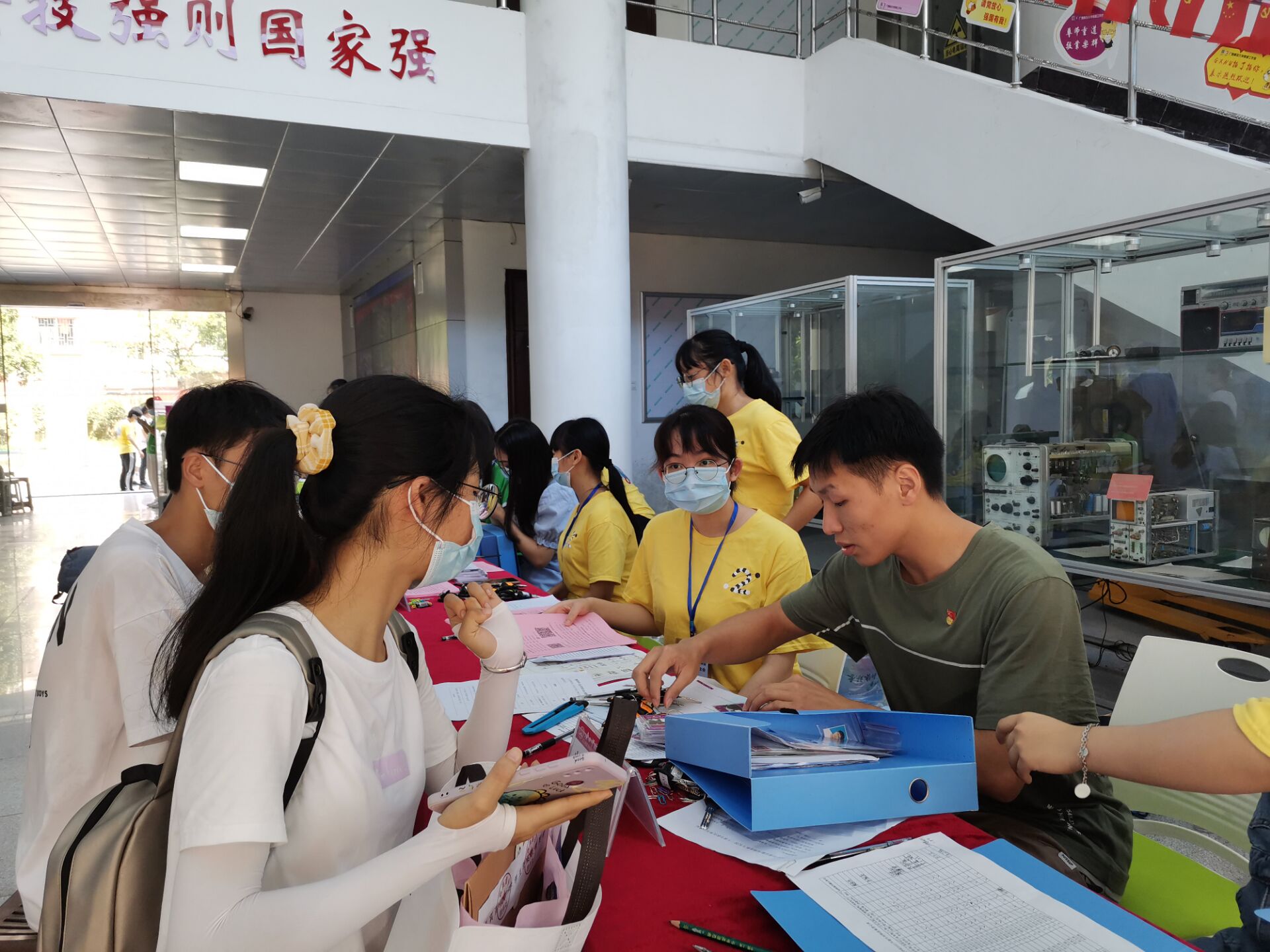 同志们指导新同学填写材料