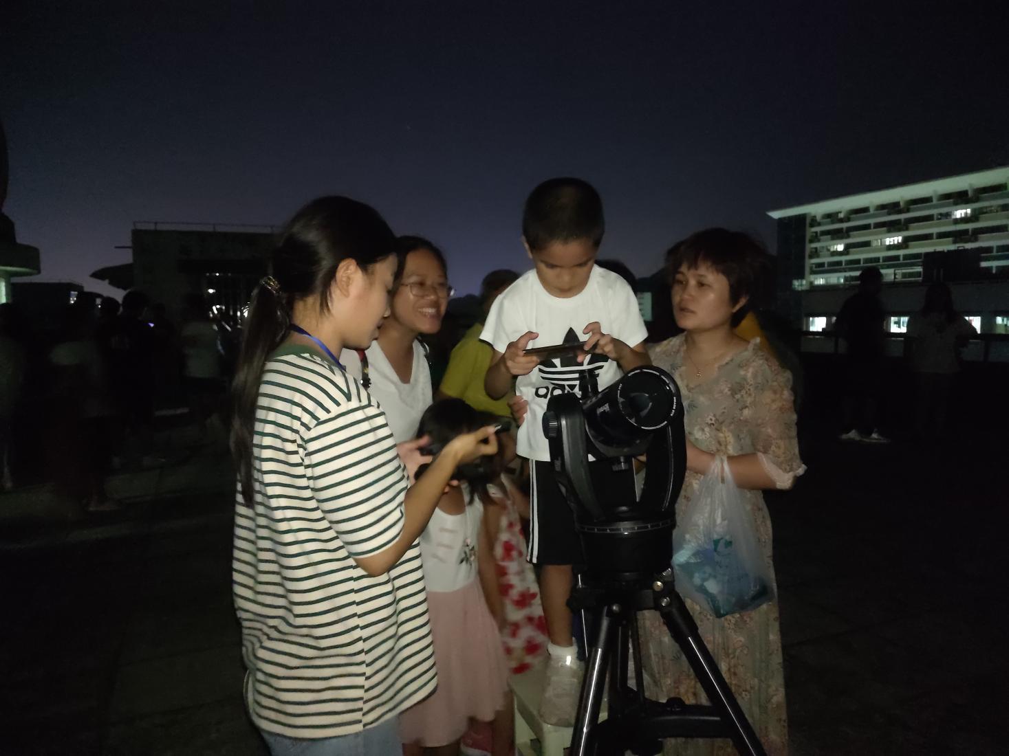活动进行时,月亮忙着营业,大家和月亮撞个满怀。来自胜游体育(SYsports)官方网站入口与技术学院、电子工程学院、化学与药学学院、职业技术师范学院的老师与学生欢聚一堂,共同体验“海上升明月,天涯共此时”的中秋情怀。学术部负责人在望远镜旁认真工作,紧跟月亮与行星的步伐,确保参与人员能实时赏月、赏星星,并在观赏间隙向参与人员科普天文学知识。现场气氛十分热烈,师生齐聚一堂畅聊家乡的故事,抒发对家乡和父母的思念之情。
