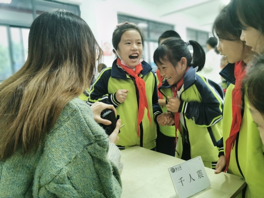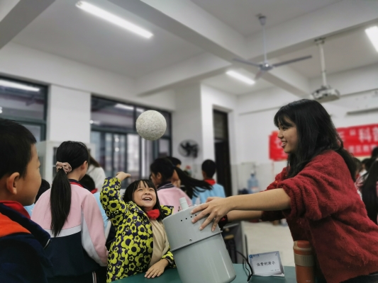 “光是沿着怎样的路径传播的呢?”“伯努利原理究竟是怎样的呢?”“真的会有能够自动沿着黑色轨道行走的小车吗?”“普氏摆是怎样神奇的一个摆呢?”……这些有趣的科学问题的答案就分别蕴藏在本次科普展活动里的有趣的科学教具里。枯燥的理论知识和有趣的科学教具碰撞就会发生奇妙的化学反应,在志愿者的耐心引导下,孩子们对展出的教具一一进行体验观察并对此展现出极大的兴趣,孩子们在挑战“画‘龙’点睛”时惊喜地观察到光的传播路径和光的反射现象,对“千人震”自感现象所产生的“触电”的感觉感到害怕又神奇,在观察伯努利小球时发现小球会随着气泵释放气体的方向改变而移动,体验空气炮时感受到小小的烟圈所蕴含的巨大能量……孩子们的思维特点还处于具象思维的阶段,最需要的就是观察和体验,而这些有趣的科普项目就巧妙地将光学、电学、流体力学等丰富的科学知识融入,和孩子们的心理特征十分契合,有些具备极强的视觉冲击效果可吸引孩子们注意力,有些有着违背孩子们原有认知的神奇科学现象可触发孩子们的认知障碍,有些可以让孩子们亲身参与可增强其参与感,孩子们在快乐中玩转科学、学习科学,不断观察、体验、思考,对科学现象的感性认识和学习科学的主动性进一步加强。