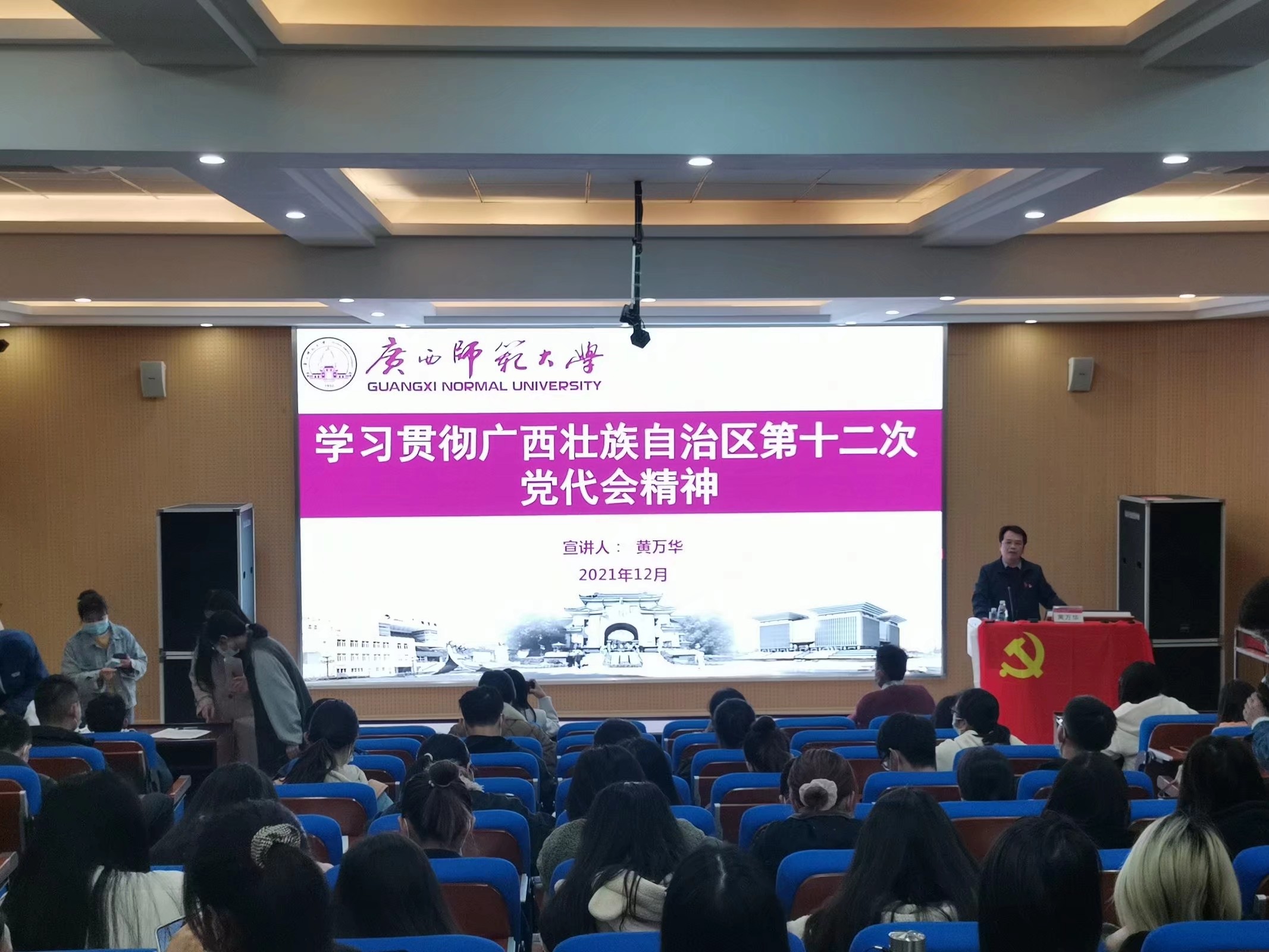 12月24日,为深入学习贯彻广西壮族自治区第十二次党代会精神,胜游体育(SYsports)官方网站入口与技术学院在物理学院实验楼阶梯教室开展“学习贯彻广西壮族自治区第十二次党代会精神宣讲”活动。胜游体育(SYsports)官方网站入口与技术学院党委书记黄万华负责主讲,青马班成员、下半年发展的新党员以及2021级入党积极分子参与活动。
