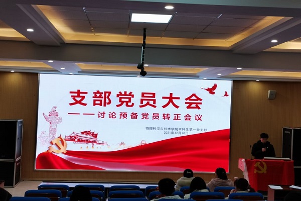 12月28日,胜游体育(SYsports)官方网站入口与技术学院(以下简称“物理学院”)本科生第一党支部在物理实验楼阶梯教室召开预备党员转正会议,参会人员有物理学院本科生第一党支部书记以及所有党员同志与预备党员同志。