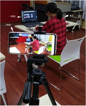 (4)复试要求双机位摄像,提前准备好一台电脑(带摄像头和麦克风)和一部智能手机,或两部智能手机。两台设备中,第一台为主机位(或一机位)(建议使用笔记本或PC机),要求放置在考生座位正前方,视频监控范围应保证考生在坐姿状态下能够完整清晰覆盖头部到桌面位置,面试过程中要始终保持双手在屏幕中显示;另一台为辅助机位(二机位),放置于考生后方45度左右位置,确保监控范围覆盖第一台设备的显示屏幕和考生本人头部、背部、手部,如下图所示。