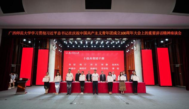 5月17日,我校在雁山校区音乐楼三楼综合厅召开学习贯彻习近平总书记在庆祝中国共产主义青年团成立100周年大会上的重要讲话精神座谈会,深入学习贯彻习近平总书记重要讲话精神,表彰我校2021年度“五四”评优先进集体和先进个人。