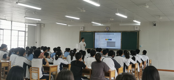 来宾一中实习生组长蒋欣琳就实习生的上课情况、听课情况、班主任工作情况与指导教师的指导情况四个方面向学院领导进行了汇报,并代表全体实习生向来宾一中全体师生员工表示感谢。