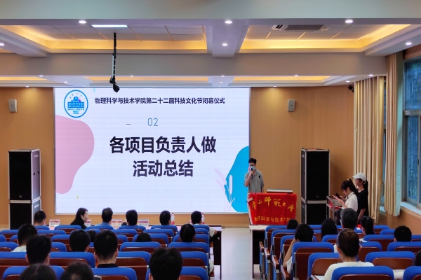 此次科技文化节的各项目负责人依次上台做活动总结,分别对各自项目的流程做了简单的介绍并且总结了开展活动的过程中的心得收获、遇到的困难与挑战以及活动中存在的不足。通过各位负责人的发言,大家对各个项目的开展过程都有了一定程度的了解,提高了活动的感染力。