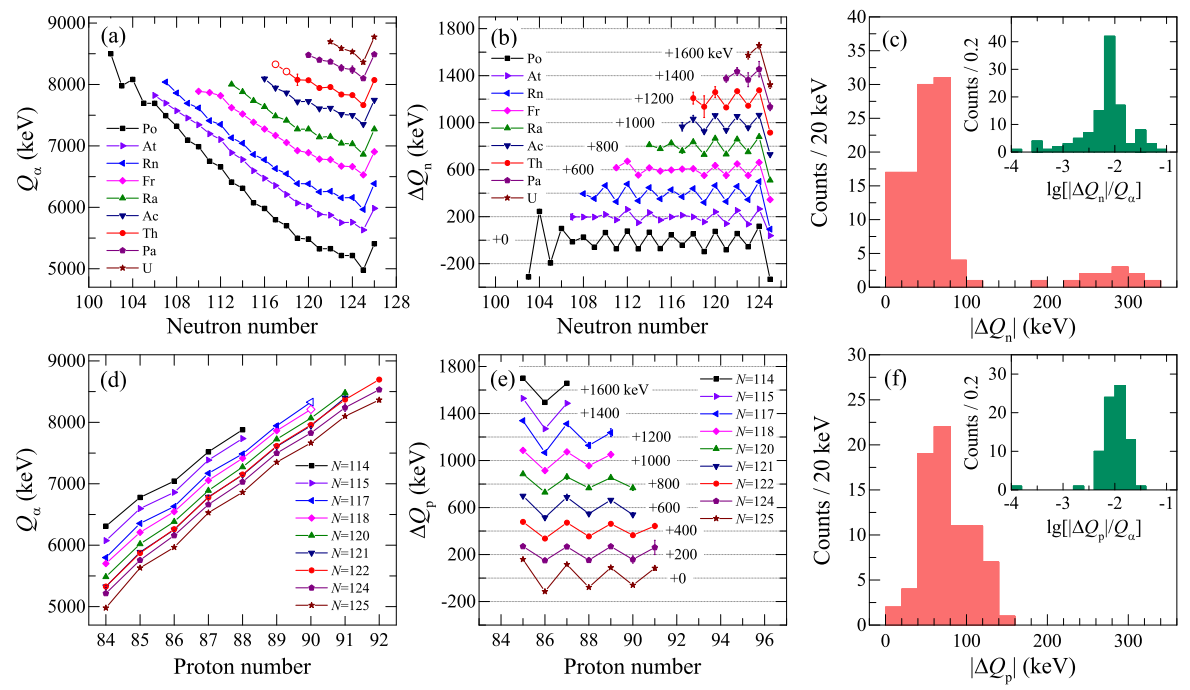 该研究还发现并解释了α衰变能的奇偶效应这一新现象。通过对新测量数据和已有数据进行系统分析,研究人员发现在Z>82,N<126核区,无论是同位素还是同中子素的α衰变能都呈现出规律的奇偶震荡,震荡幅度为20-160 keV。而这一发现与人们通常根据Bethe-Weizsacker公式认为的α衰变能不存在奇偶效应相矛盾,也对于进一步改进原子核质量公式提出了要求。