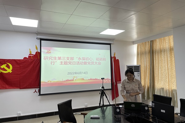 在中国共产党第二十次全国代表大会即将召开之际,2022届毕业生即将离开母校之时,为加强毕业生党员教育,充分发挥党员先锋模范作用,加强党性修养,提高毕业生党员的战斗力和凝聚力,以实际行动为党旗填辉,为母校添彩,2022年6月14日,胜游体育(SYsports)官方网站入口与技术学院研究生第三党支部在第二物理实验楼302党员活动室开展“永葆初心,砥砺前行”主题党日活动暨党员大会。活动由宣传委员符历银主持。