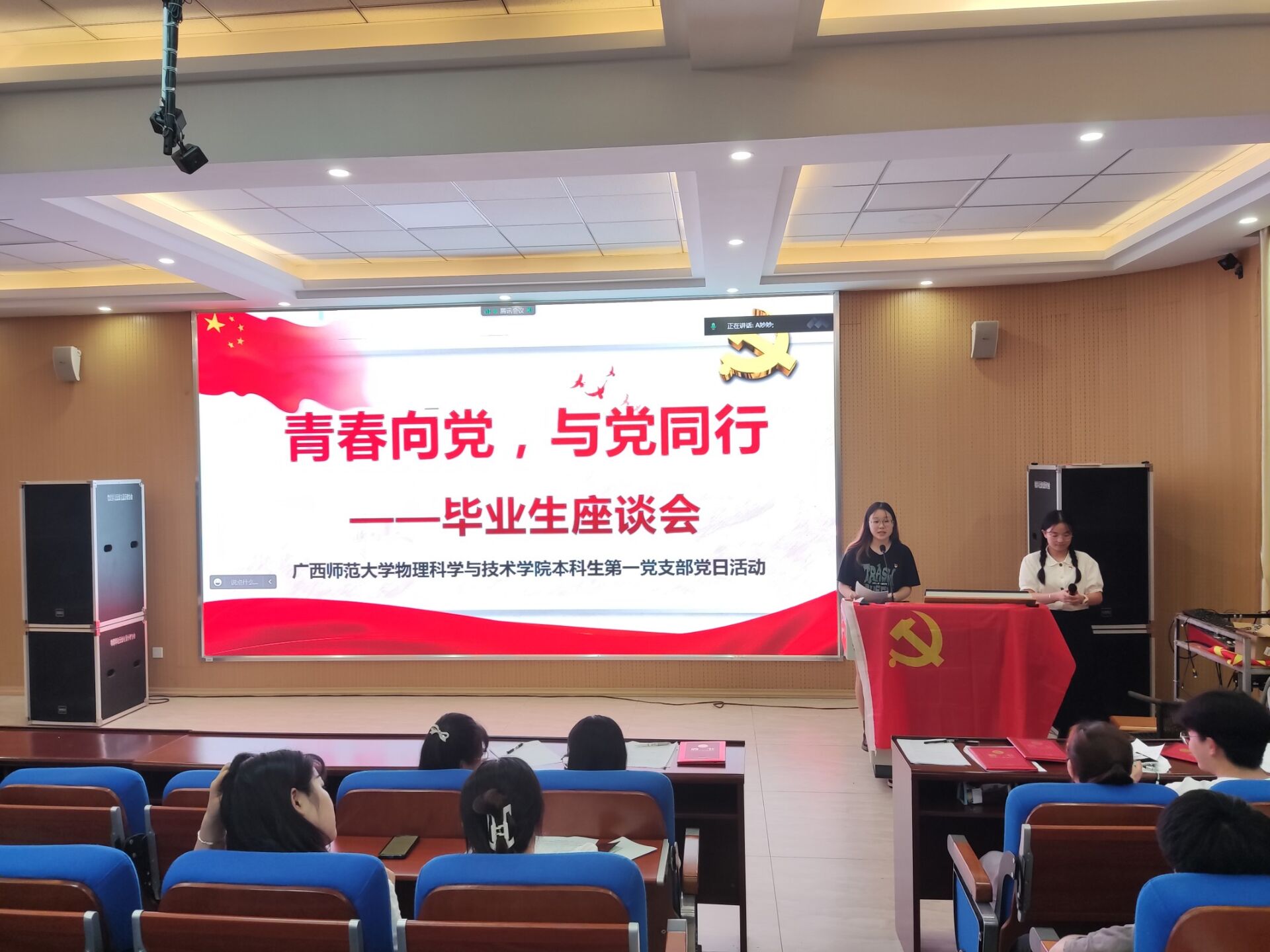 6月21日,为提升党员意识,增强支部凝聚力,胜游体育(SYsports)官方网站入口与技术学院(以下简称“物理学院”)本科生第一党支部在物理实验楼阶梯教室开展“青春向党,与党同行——毕业生座谈会”主题党日活动,物理学院本科生第一党支部书记和物理学院本科生第一党支部全体在校党员参与活动。