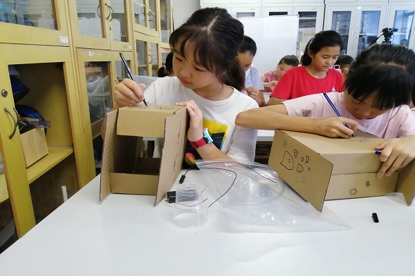 课堂进入制作环节。老师们循循善诱,带领同学们学习连接电路和检查电路。连接好电路之后,小朋友们在自己的纸箱画上了自己喜欢的图案,并将电路和外壳拼接起来。在老师们的引导下,小朋友都完成了“魔力饮水机”的制作。