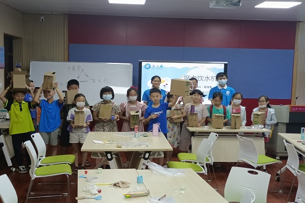 课堂尾声,主讲老师带领小朋友们回顾了课堂所学知识重点。最后,小朋友们拿着自己制作好的“魔力饮 水机”一起合影留念,今天的课堂圆满结束。