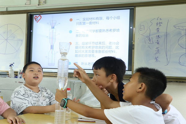 实验课上志愿者用塑料瓶,吸管,热熔胶,打孔器等制作的简易版希罗喷泉