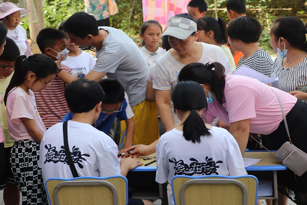 在正式上课的前一天,志愿者们在学校门口进行夏令营的招生工作
