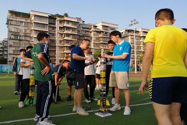 最后便是大家最期待的发射水火箭的环节了。学习和实操的结果如何会在最后发射的三四分钟得到检验。所有人都带着兴奋、紧张与喜悦的心情,期待着最终结果。同学们接力为水火箭充气,在同学们满怀期待的注视中,水火箭顺利升空。40米、50米、60米…看着不断升高的水火箭,同学们发出阵阵欢呼声。