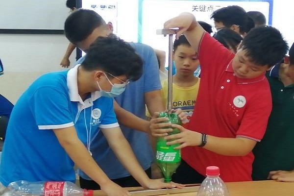 在本次的桂林市第十四中学科技文化节制作教学活动中,同学们通过对水火箭的制作,了解了气密性对水火箭的重要性,气压的巨大能量等科学知识,动手能力也得到了培养。科学制作课堂引导学生在做中学,这种寓教于乐的形式使得同学们积极参与到课堂学习中,既培养了学生对科学的兴趣又拓宽了他们的知识面。