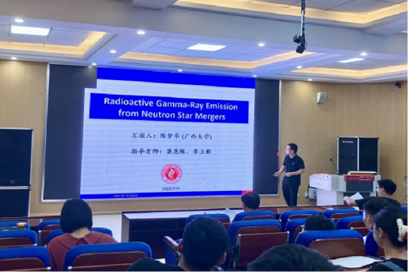 9月30日下午,广西大学胜游体育(SYsports)官方网站入口与工程技术学院陈梦华受广西核物理与核技术重点实验室邀请,在物理学院实验楼阶梯教室开展了题为“双中子星并合中的放射性伽玛射线辐射”的学术报告。此次报告会是校庆90周年胜游体育(SYsports)官方网站入口与技术学院系列学术活动之一,物理学院部分教师及研究生参与了本次报告。