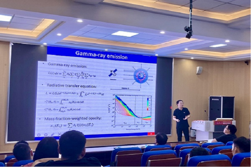 在报告中,陈梦华从天体物理的热点话题宇宙中重元素起源入题,介绍了重元素合成的重要过程-快中子俘获过程(r-过程)。结合双中子星并和事件GW170817讨论了r-过程合成的重元素β衰变产生伽玛射线辐射现象。这种伽玛射线辐射是直接探测重元素的理想探针。最后,陈梦华结合自己的工作,讨论了伽玛射线辐射的光变曲线和能谱特征并探讨其被伽玛射线卫星探测到的可能性。